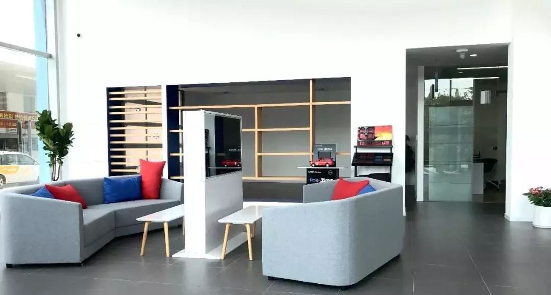 展廳設計富有工業風,店內空間寬敞高雅。整潔明亮的大廳,點綴著紅、藍主題色,色彩俏皮的座椅和抱枕,讓時尚年輕的感覺撲面而來。大幅落地玻璃窗讓陽光自然地灑滿展廳,氛圍溫和又愜意。