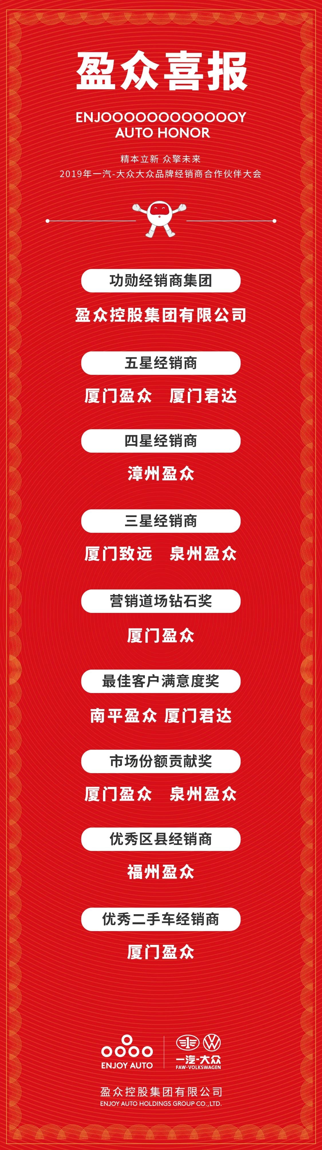 盈眾榮獲一汽-大眾功勛經(jīng)銷商集團(tuán)、五星經(jīng)銷商等多項(xiàng)大獎(jiǎng)
