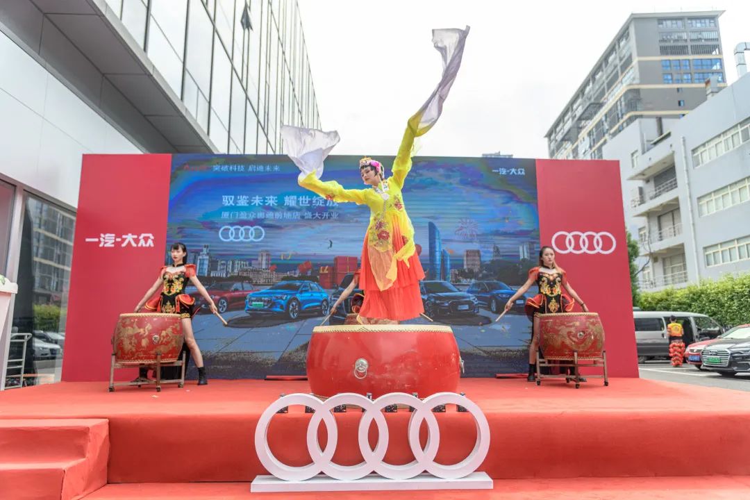 一汽-大眾奧迪銷售事業部東南區區域主管銷售經理葉鵬、一汽-大眾奧迪銷售事業部東南區區域服務與二手車經理包洋、廈門盈眾至遠汽車銷售有限公司總經理嚴勁松等,共同為廈門盈眾奧迪前埔店全新數字化體驗中心剪彩慶賀。精彩紛呈的舞獅表演將現場氣氛推向高潮。
