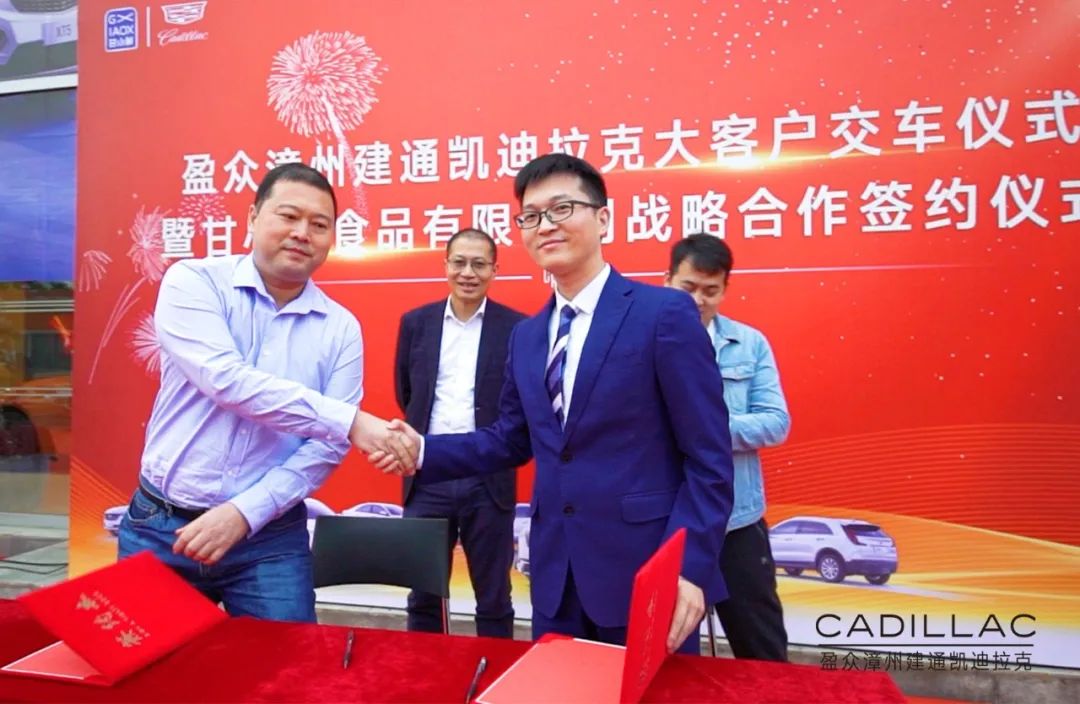 在到場人士的共同見證下,盈眾漳州建通凱迪拉克總經理曾蛟龍與甘小鮮(福建)食品有限公司總經理常俊崗簽署了戰略合作協議,并現場完成首批八臺凱迪拉克交車儀式。