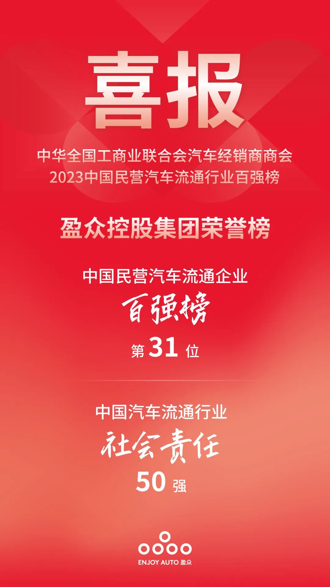 盈眾控股集團成功入選“中國民營汽車流通企業百強榜”,位列第31位。