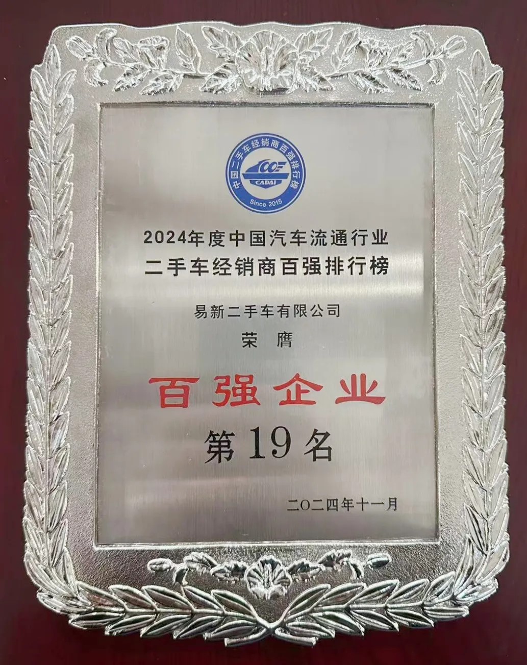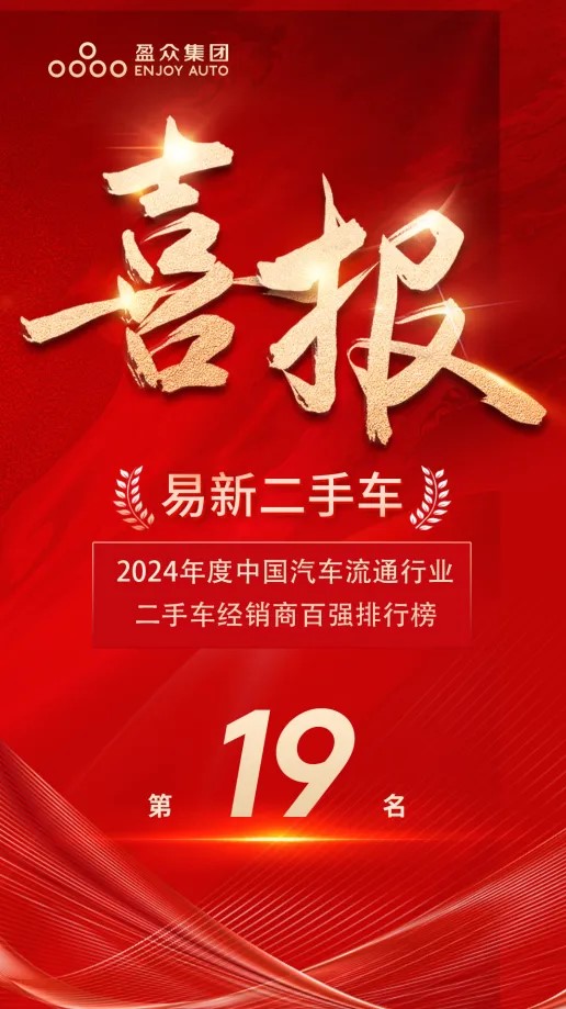 喜報 | 盈眾旗下易新二手車榮膺2024年度中國汽車流通行業二手車經銷商百強排行榜第19名
