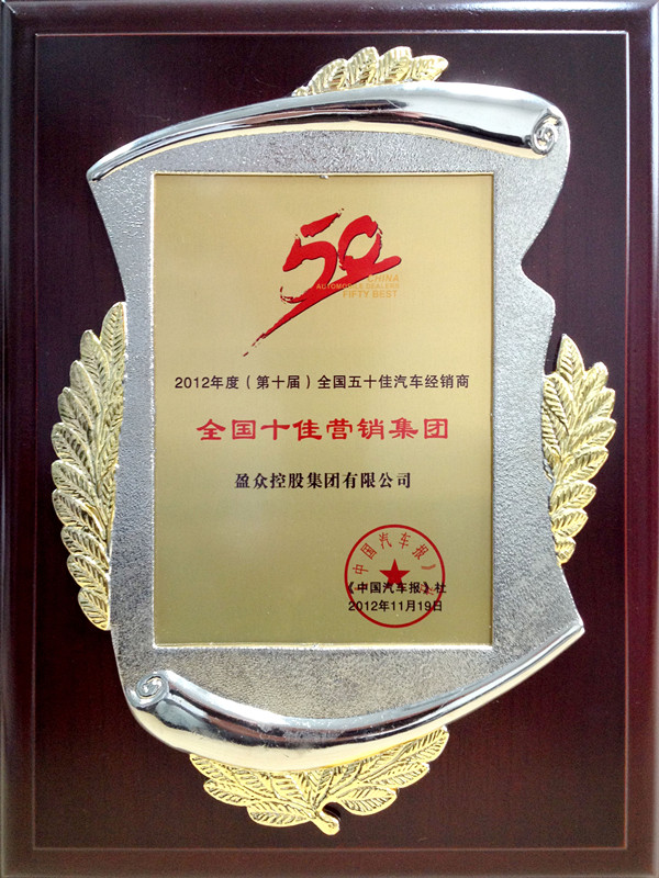 2012年,中國汽車市場增長放緩,汽車產(chǎn)業(yè)進入新一輪調(diào)整期。作為海西領(lǐng)先的汽車經(jīng)銷商,盈眾汽車全體員工,精誠團結(jié),艱苦奮斗,共同應(yīng)對挑戰(zhàn),以全方位出色的表現(xiàn)獲得了行業(yè)協(xié)會及媒體的認可和表彰,榮膺“全國十佳營銷集團”,并榮獲多項行業(yè)大獎。